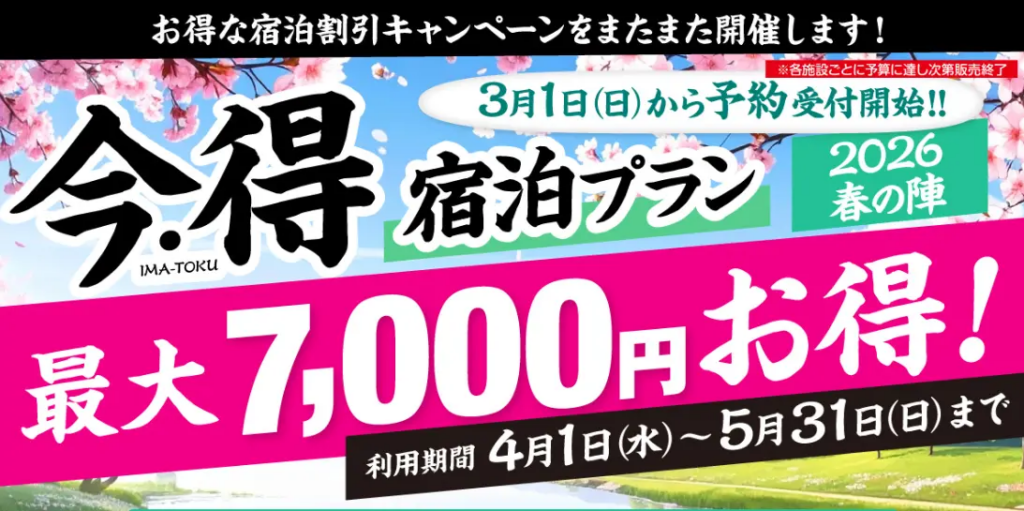 最大5,000円宿泊割引+御菓子2,000円分付き!2026年4月1日~5月31日 新潟県新発田市「今・得キャンペーン」3月1日より予約受付中!