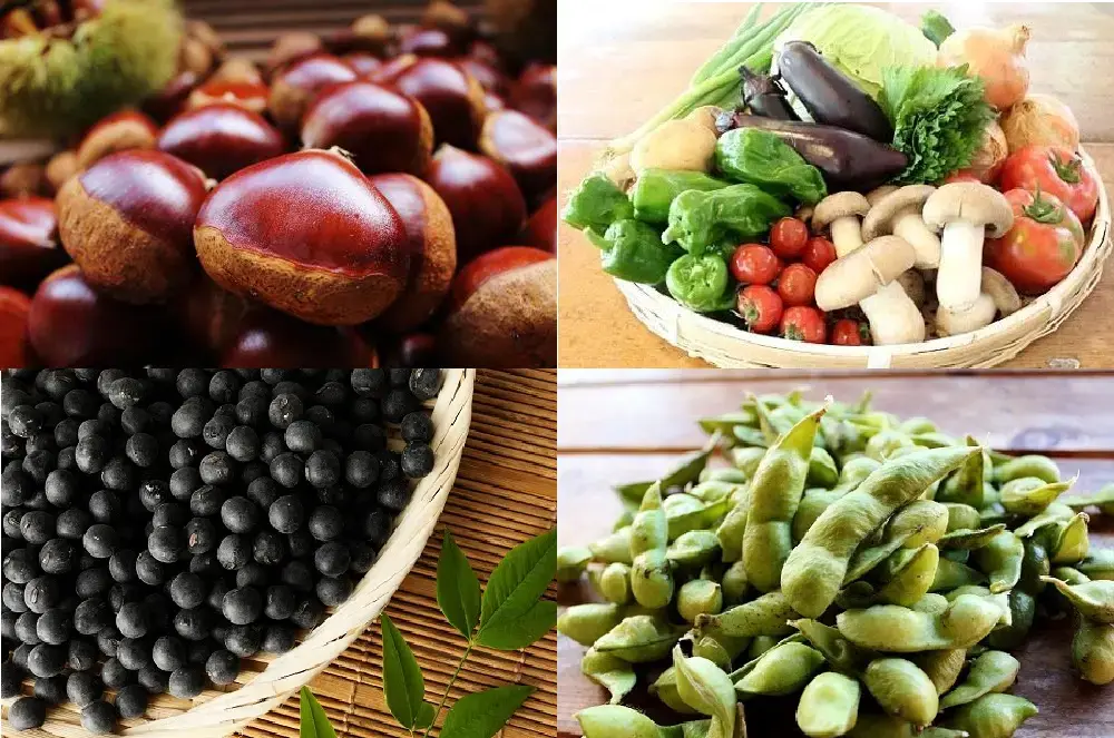 京丹波食材は、粒が大きく甘みの強い「京丹波栗」や、芳醇な香りと瑞々しい弾力を持つ「丹波松茸」、大粒でコクと旨味豊かな「黒大豆」や、その黒大豆を早摘みした「丹波黒豆の枝豆」、大黒様のふくよかなお腹のように軸が膨らんだ「大黒本しめじ」など、滋味深く力強さを持つ食材が数多くあります。