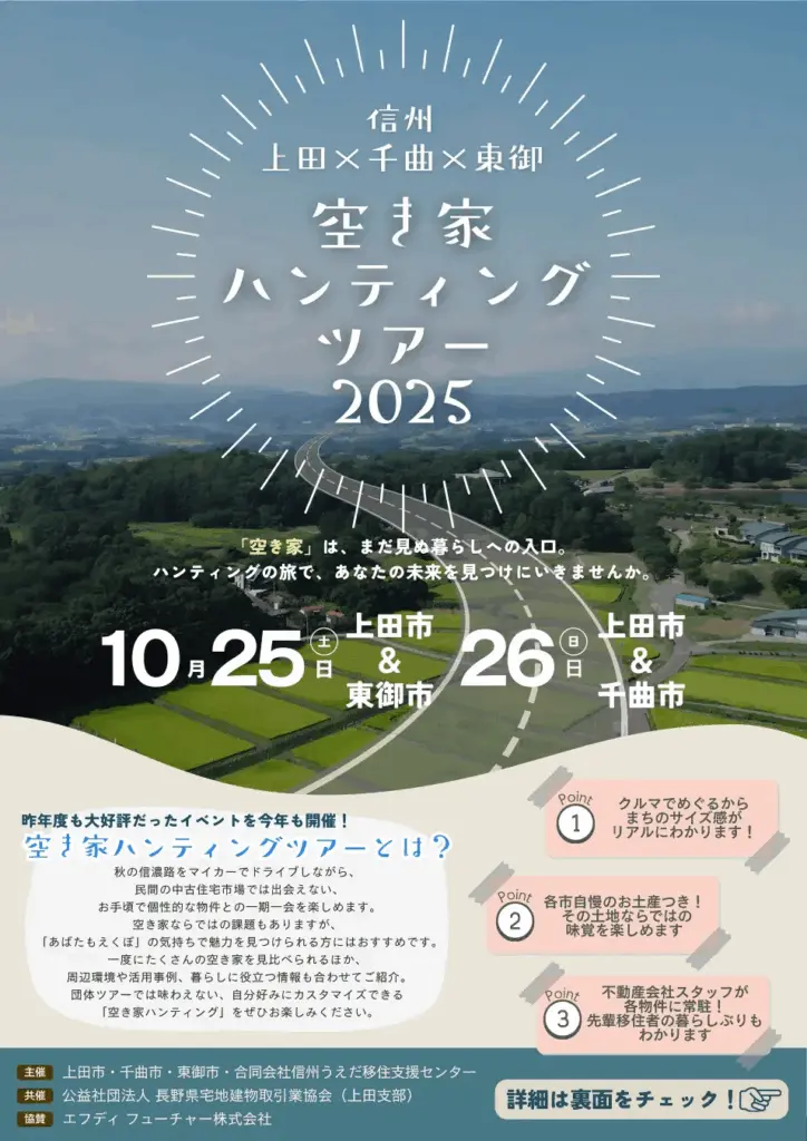 長野県東御市は、上田市・千曲市と合同で「空き家ハンティングツアー2025」を開催します。