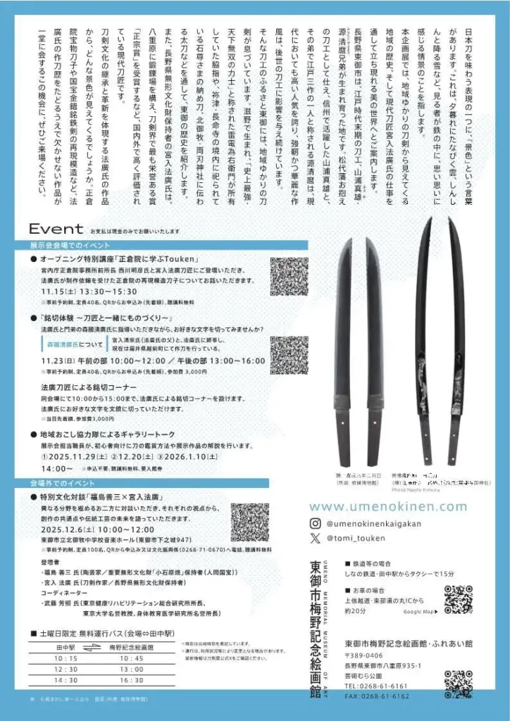 本展では、地域にゆかりのある刀剣を通して見えてくる東御の歴史、そして現代刀匠宮入法廣氏の仕事を通して立ち現れる美の世界へとご案内します。