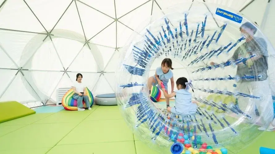お子さまが安全に楽しめる玩具・エアコンなどを備えた40㎡のドーム型テント2基や全長10mのウッドデッキエリアでは紅葉を望みながらリクライニングチェアーでゆっくりと読書なども楽しめます。