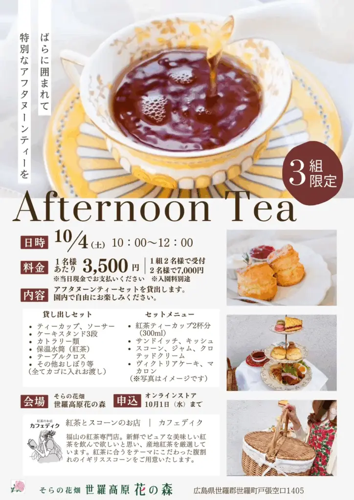 ばらに囲まれてアフタヌーンティーを楽しむ特別な体験をご用意しています。アフタヌーンティーセットを貸出し、園内のお好きな場所で紅茶やスコーンなどをお楽しみいただけます。先着3組限定です。
