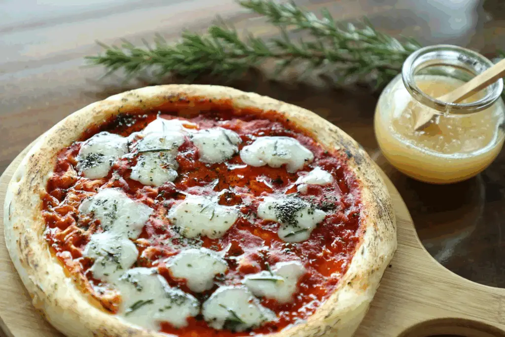 園内で採れたローズマリーをのせた大人気のマルゲリータ風のピザです。お好みで世羅産はちみつをトッピングしてお楽しみください。