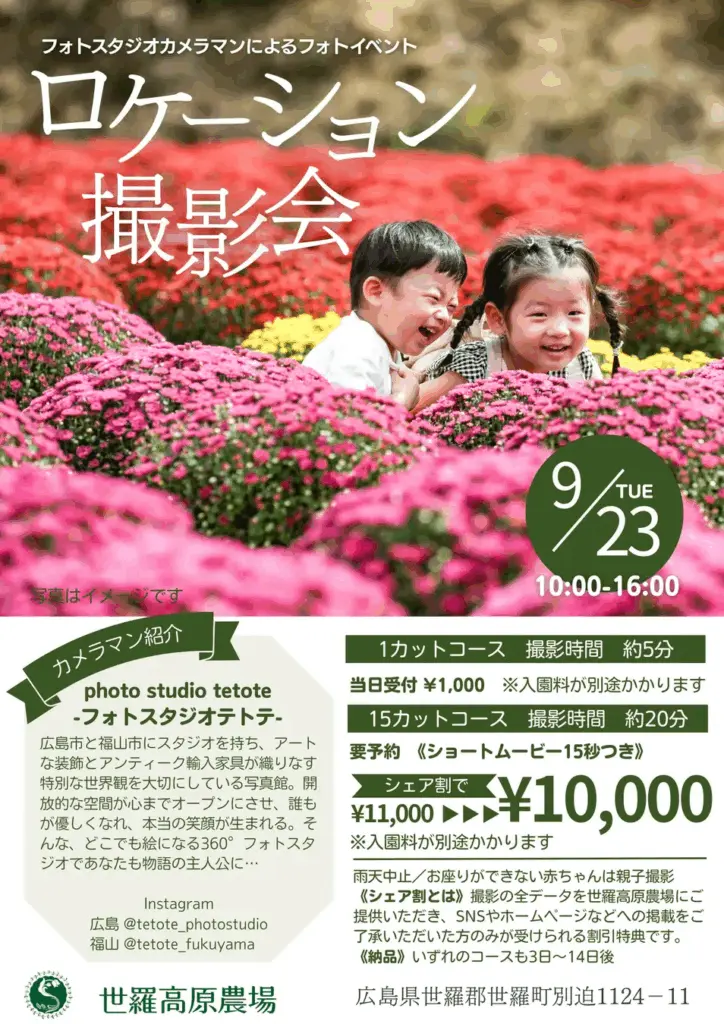 フォトスタジオカメラマンが撮影する、お花畑での撮影会です。ショート動画付きのプランもあります。