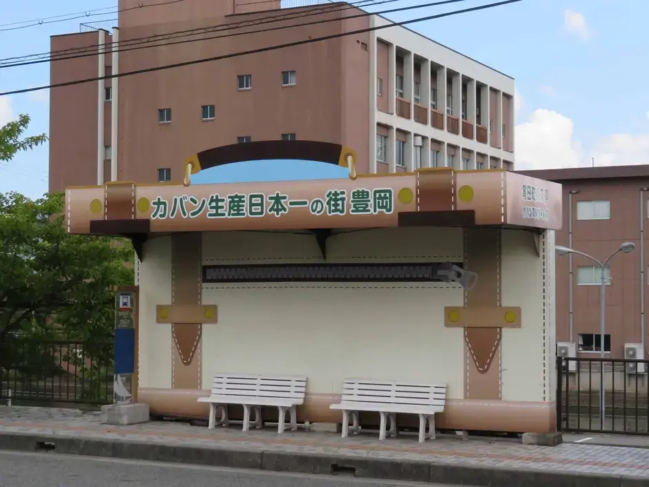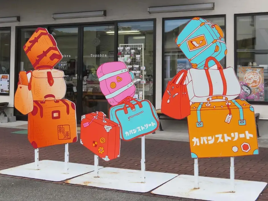 カバンストリートとは、豊岡市中心部の「宵田(よいだ)商店街」周辺エリアの名称です。カバン専門店やカバン修理店、カバンを取り扱うお店などが15店舗以上点在しています。また、ストリート周辺には「カバンの自動販売機」やカバンをモチーフにしたバス停やベンチなど様々なオブジェも存在します。