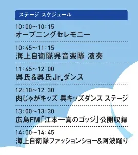 広島FM「江本一真のゴッジ」公開収録(ゲスト:コワモテ料理長)をはじめ、海上自衛隊音楽隊による迫力ある演奏や、呉市公式キャラクター「呉氏」と「呉氏Jr.」によるダンスパフォーマンスも予定。