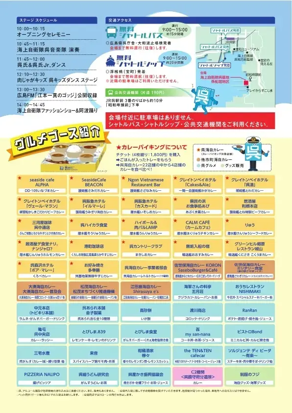 | アクセス | (1) 無料シャトルバス ・呉駅前(広島県呉庁舎)⇔ 会場付近(IHI駐車場) ・大和波止場横 ⇔ 会場付近(IHI駐車場)(2) 無料シャトルシップ ・浮桟橋(宝町) ⇔ 会場 |