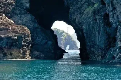 荒波にうがたれた海食洞門。美しい海と神話に彩られた新潜戸に感嘆した八雲は、泳ごうとしたものの神聖な場所として周囲に止められて、しぶしぶあきらめたといいます。