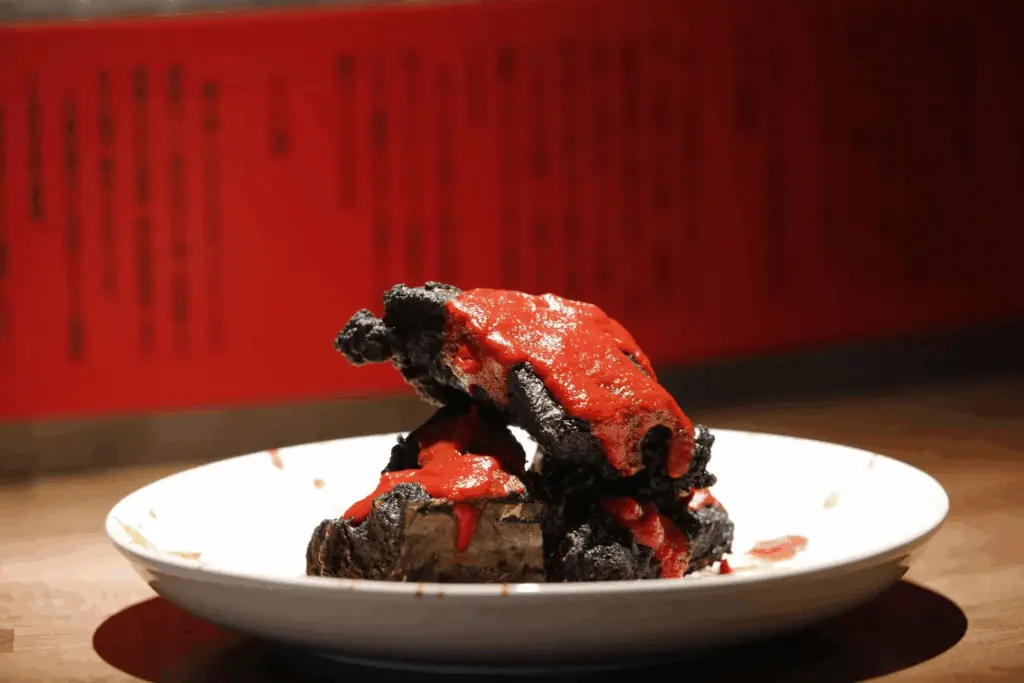 怪談をイメージさせる赤と黒をモチーフにしたメニューで、マグロのカマをから揚げにし、上にはトマトソースをかけています。脂がのったマグロのカマを揚げると外はカリっ、中はトロっとした食感となり、さっぱりとしたトマトソースがよく合います。