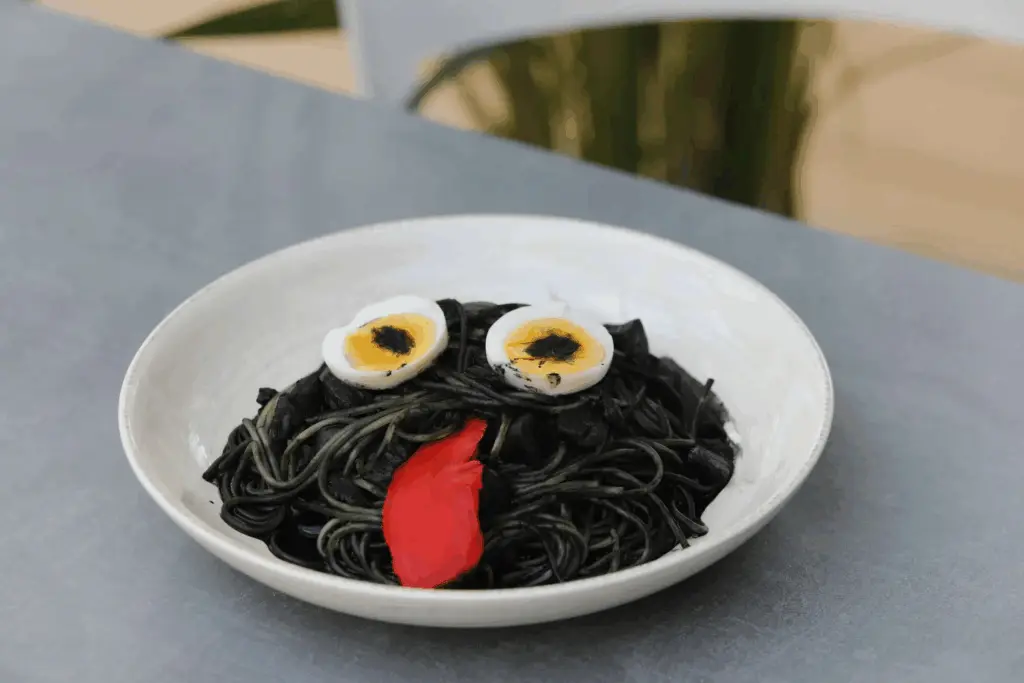 季節の食材をふんだんに使ったイタリアンや、シェフの創作料理が楽しめる「Taverna Content」が提供するのは「見つめる怪異のイカスミパスタ」です。