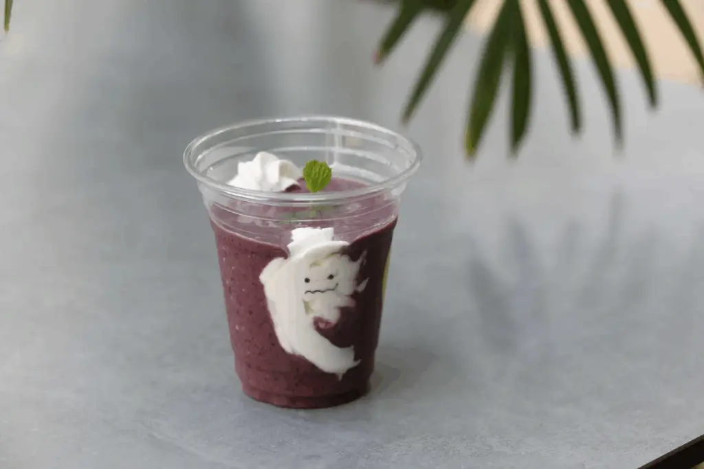自家製のアサイードリンクにホイップクリームでおばけを可愛らしくトッピングしました。飲み進めていくと、おばけがいろんな形に変化していくかも!?