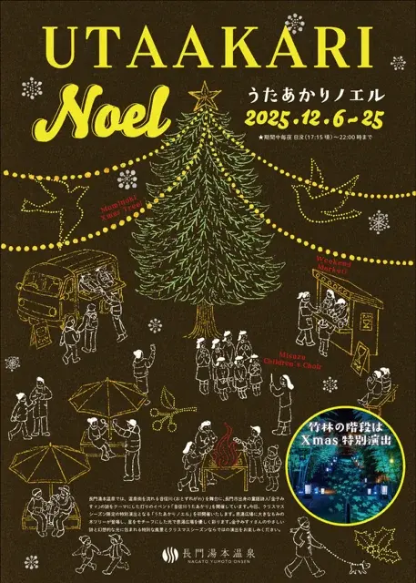 今回、クリスマスシーズン限定の特別演出となる「うたあかりノエル」を初開催。恩湯広場に大きなもみの木ツリーが登場し、星をモチーフにした光で恩湯広場を優しく彩ります。