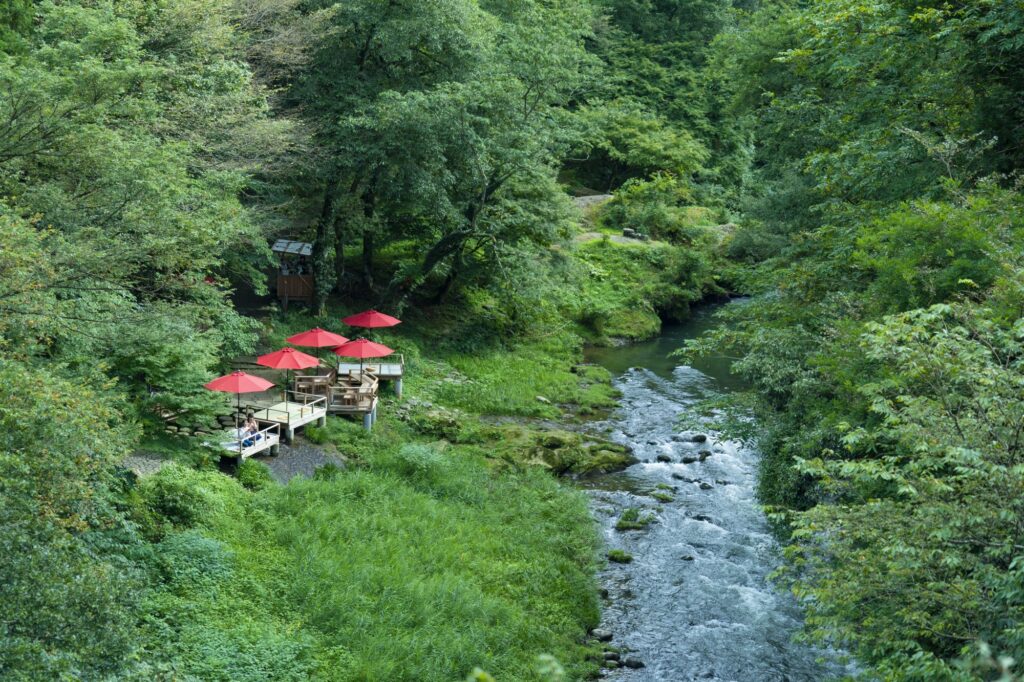 山中温泉の名所である「鶴仙渓」では、山中温泉の風物詩である「川床」が設けられ、周辺の風景とのコントラストが楽しめます。