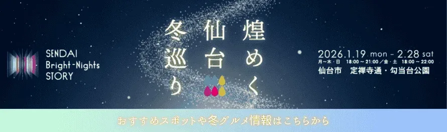 定禅寺通での新たなイルミネーション「SENDAI Bright-Nights STORY」や、多彩な冬スポット巡り、冬グルメをお楽しみください。